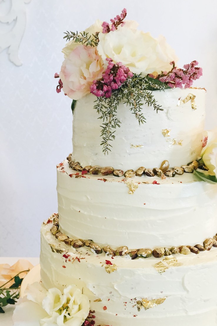 Anyway, the bride, who happens to be my lovely friend from nursing school, Connie, asked for the pink and white cake with more gold! Of course, I had to whip out my gold leaf and gold dust. Also, if anyone’s curious, the flavour is also pink forest!!