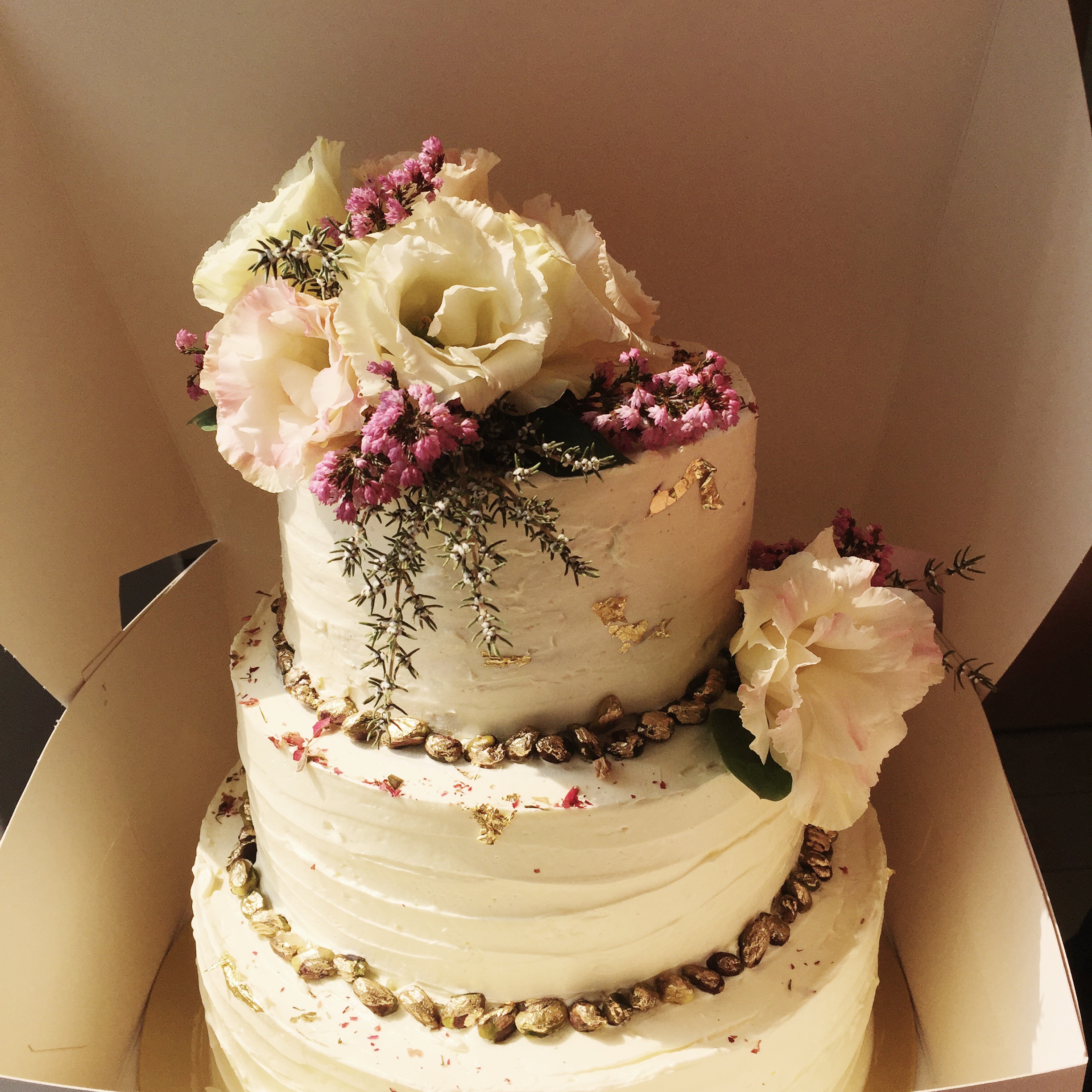 Anyway, the bride, who happens to be my lovely friend from nursing school, Connie, asked for the pink and white cake with more gold! Of course, I had to whip out my gold leaf and gold dust. Also, if anyone’s curious, the flavour is also pink forest!!