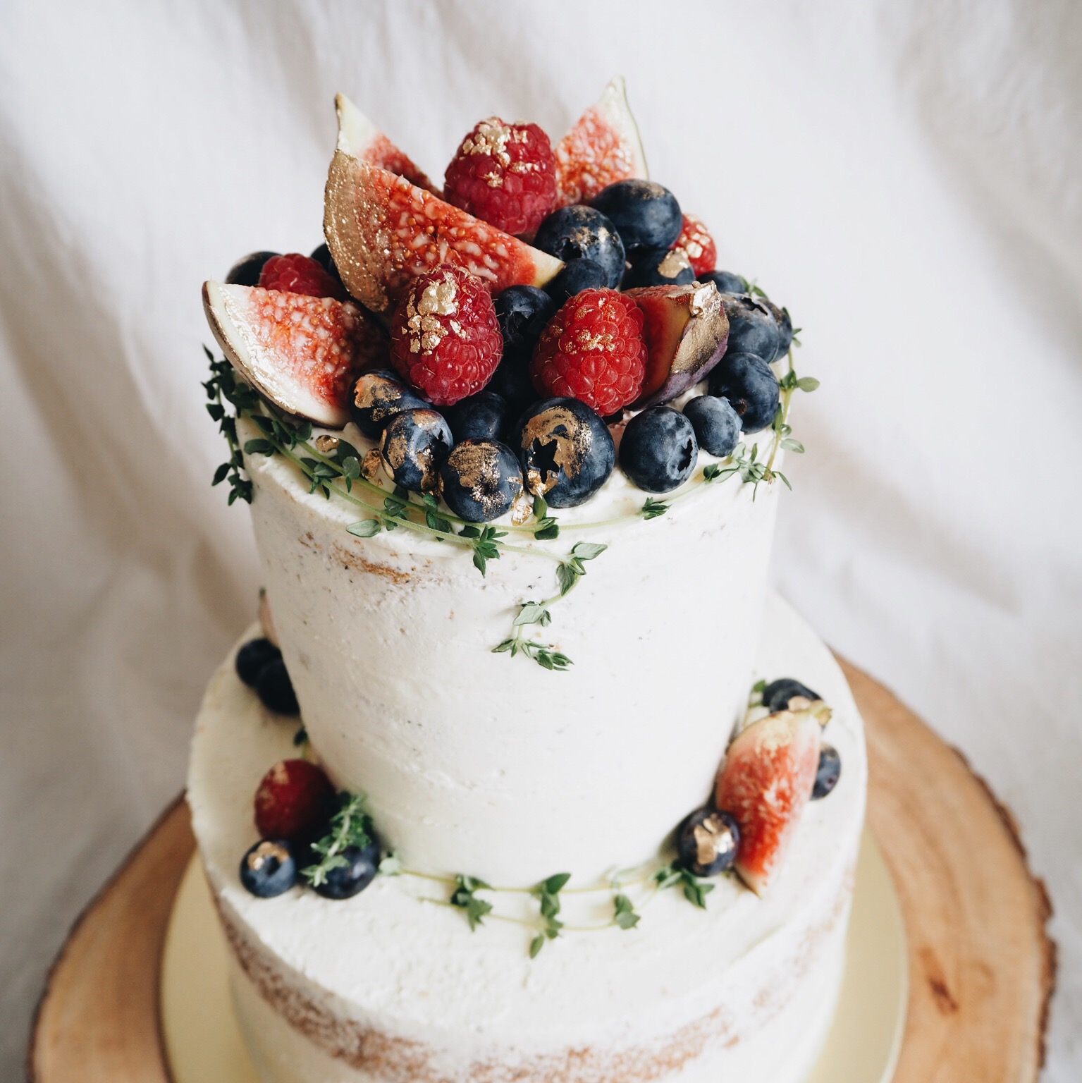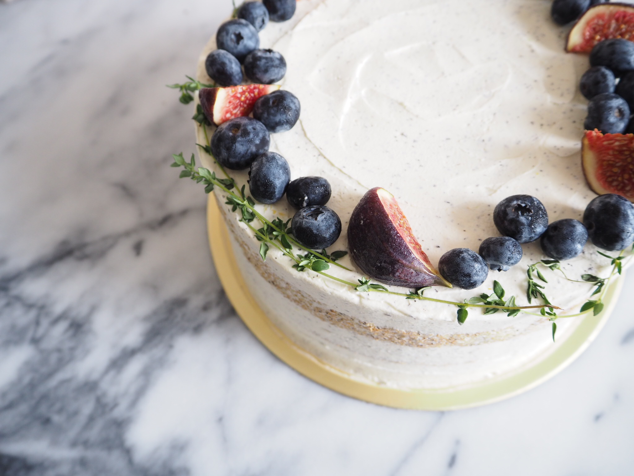 Absolutely in love with the combination of earl grey and tangy, citrusy lemon curd. Specks of earl grey throughout the cake sponge and cream with lemon curd sandwiched between the layers, adorned with a ring of blueberries, figs, some foliage and a little gold dust.