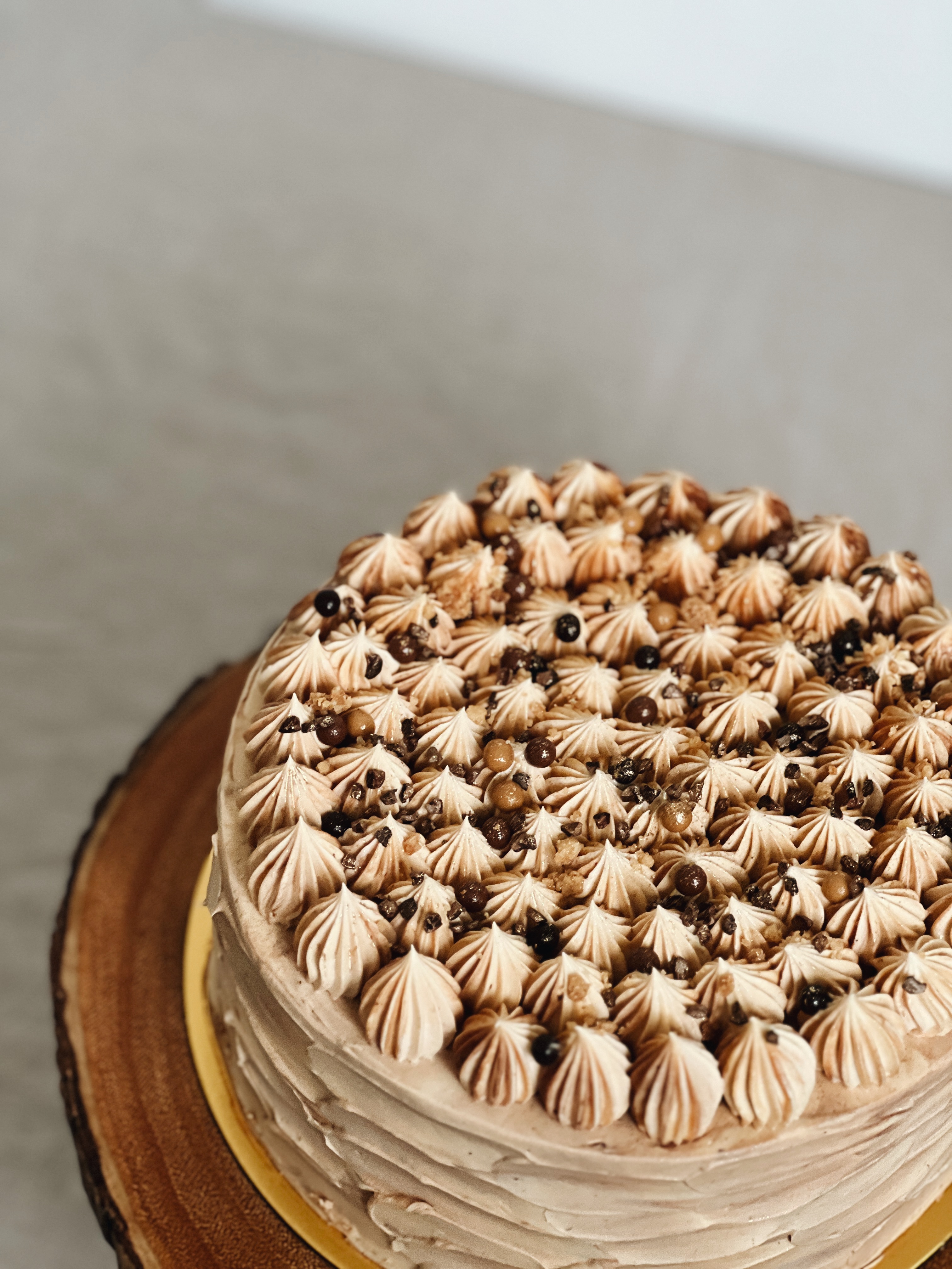 Salted caramel butter cream is streaked with dark chocolate ganache and salted caramel and layered in between dark chocolate cake and caramelised cookie crumble.