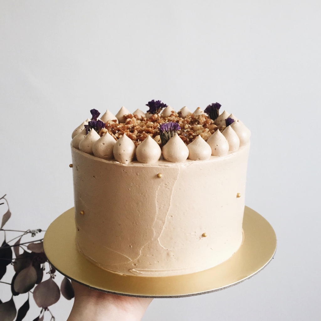 Coffee and walnuts sponge cake, walnut praline, kahlua and espresso buttercream