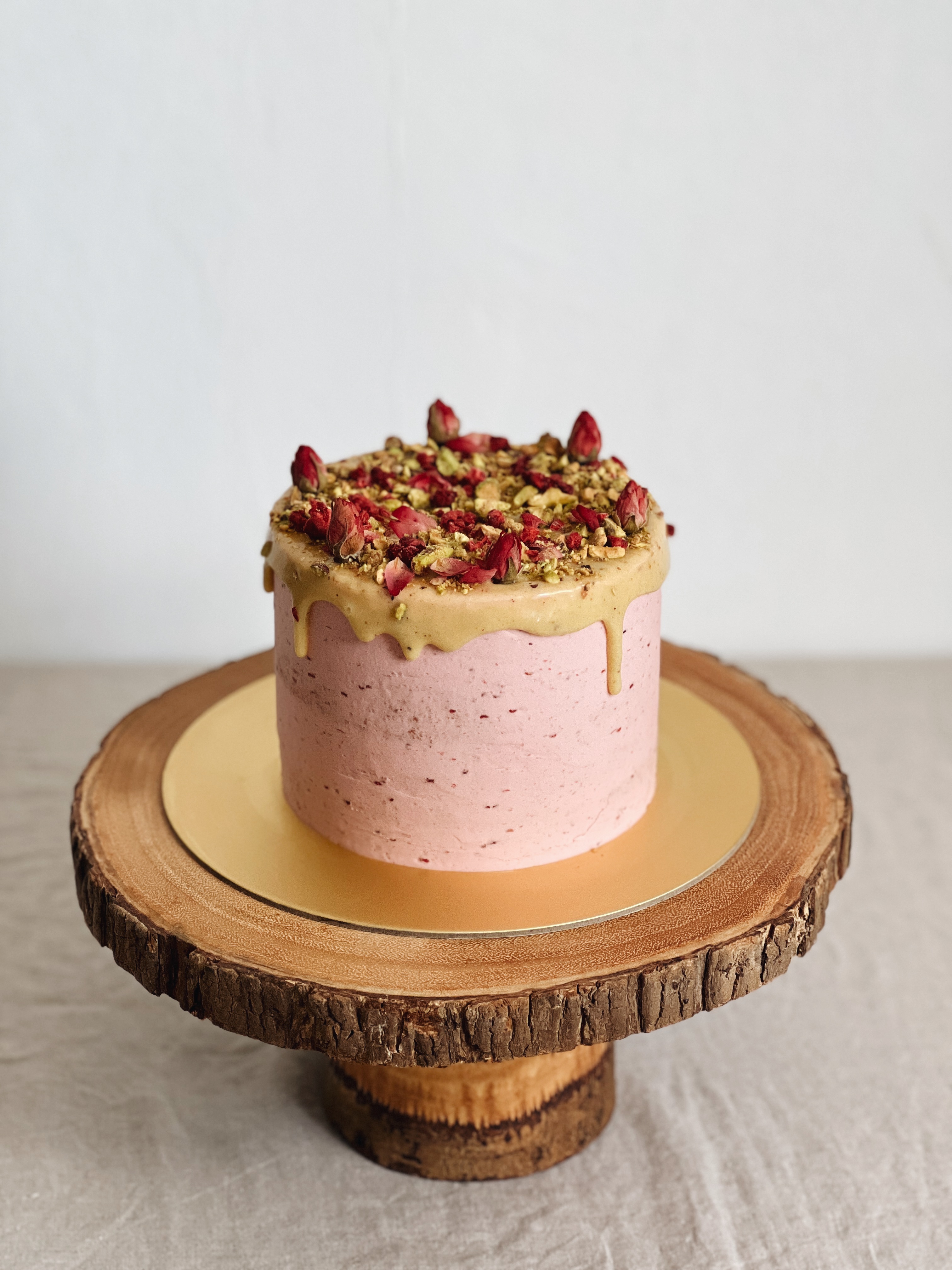 Rose water cake, textures of raspberry & pistachio and white chocolate pistachio glaze